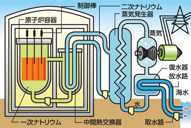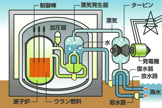 ウラン燃料からでる熱で水を沸騰させて蒸気を作り、この蒸気の力でタービン(羽根車)を回し、発電機を回して電気を作ります。火力発電所がボイラーで石油、石炭、LNGなどを燃やして蒸気をつくるのに対し、原子力発電は水の入った原子炉の中でウランの核分裂を起こし、その熱で蒸気を作ります。