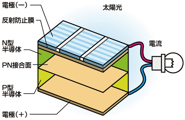 太陽電池はプラスを帯びやすいP型シリコン半導体と、マイナスを帯びやすいN型シリコン半導体を張り合わせてあります。
