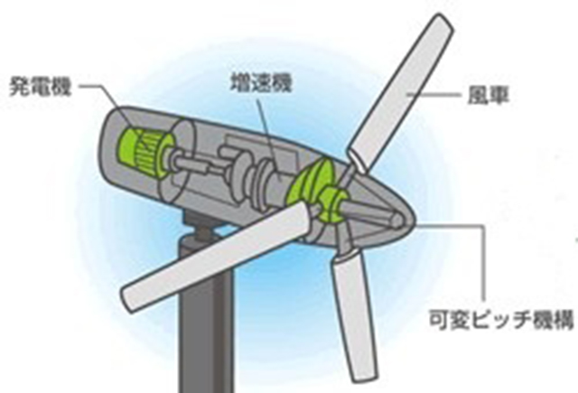 風の力を利用して風車を回し、風車の回転運動を発電機に伝えて電気を起こします。