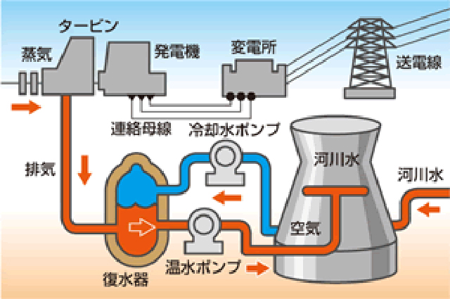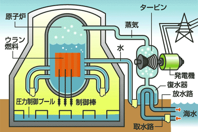 ウラン燃料からでる熱で水を沸騰させて蒸気を作り、この蒸気の力でタービン(羽根車)を回し、発電機を回して電気を作ります。火力発電所がボイラーで石油、石炭、LNGなどを燃やして蒸気をつくるのに対し、原子力発電は水の入った原子炉の中でウランの核分裂を起こし、その熱で蒸気を作ります。