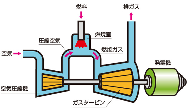 灯油や軽油、LNG(液化天然ガス)などの燃料を燃やして温度の高い燃焼ガスを作り、そのエネルギーによってガスタービンを回し、電気をつくる発電方式です。身近なものでは、飛行機を動かすジェットエンジンなどに使われている発電方式で、発電効率は約25%です。