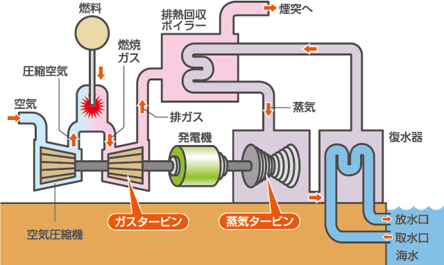 ガスタービンを回したあとの残りのエネルギーで蒸気タービンを回す効率の良い発電方式です。