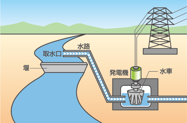 水が高いところから低いところへ落ちる力を使って水車を回し、発電機を回して電気を作ります。水車を回すには、たくさんの水を必要とするので、川にダムをつくって水をせき止めて利用します。