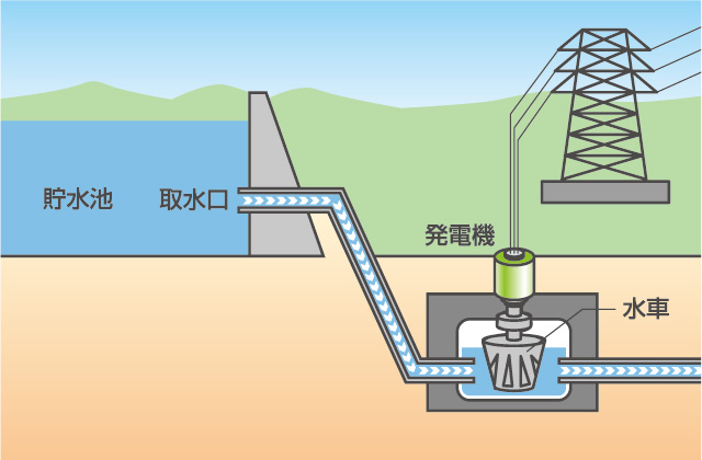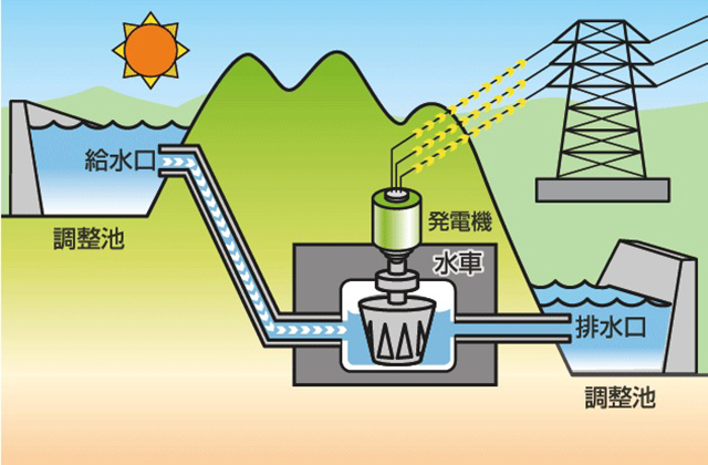 水力発電の中には、夜間、火力発電所や原子力発電所でつくられた電気で水を汲み上げ、昼間の電気がたくさん使われるときに、この水を落として発電に使う揚水発電所もあります。
